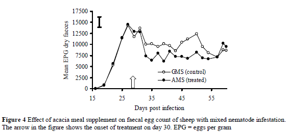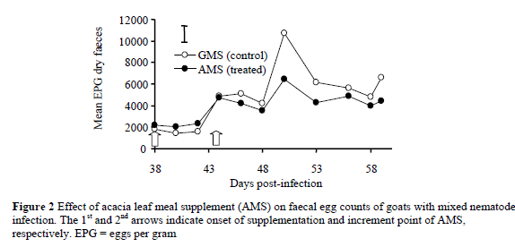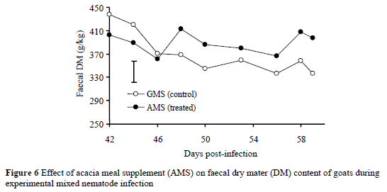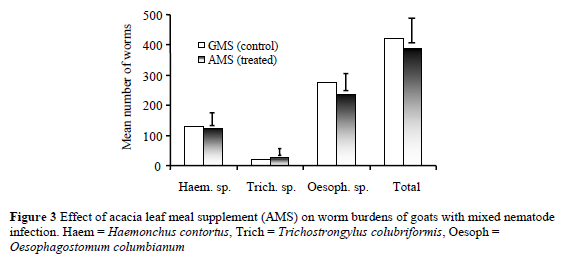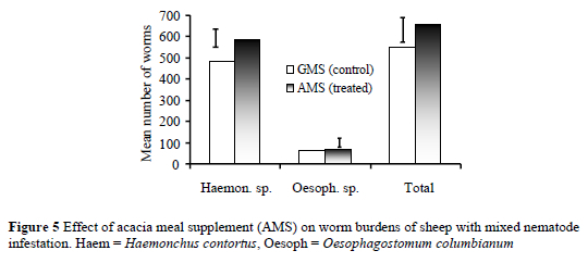 This study has demonstrated that tanniniferous browse plants are available in the study area and that leaves harvested after the main rainy season have the highest concentration of CT. These can be harvested, dried and stored for use during the rainy season when the incidence of nematode infestation is the highest. Although AMS showed a limited anthelmintic effect its consumption was associated with increased resilience to worm infestations particularly in goats. The best way to harness the limited anthelmintic activity of AMS and possibly other tanniniferous plants is to combine their use with other husbandry techniques designed to reduce the impact of intestinal parasites, such as controlled grazing, improved nutrition, selective chemical anthelmintic treatment as well as selective breeding for resistant hosts. Further studies are needed to assess the effect of feeding tanniniferous browse on various parameters of worm epidemiology such as egg hatchability, larval survival and pasture contamination.