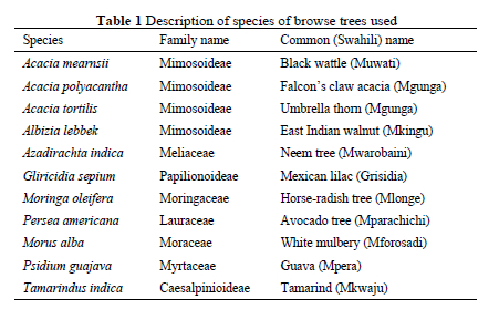 The studies were carried out at the Sokoine University of Agriculture in the town of Morogoro, Tanzania, which is located at 6°48'S - 37°36'E and ca. 500 m above see level. The area experiences two rainy seasons with ambient temperatures ranging from 15 to 35 °C. Browse trees and shrubs are widely distributed in most parts of the Morogoro region and constitute a considerable proportion of livestock diets especially during the long dry season because they are drought tolerant and readily available (Mbuya et al., 1994).