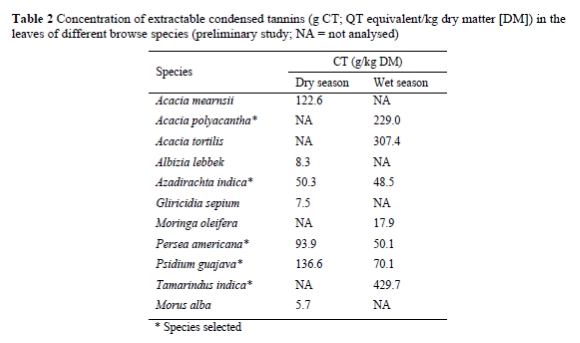 Results for the CT concentrations in leaves of 13 species of browse plants are shown in Table 2. Five species selected for their high CT content were analysed monthly and results are presented in Figure 1. Of the five species, A. polyacantha had the highest overall mean CT concentration (283 g/kg DM), while the lowest mean value of 58 g/kg DM was measured in the Neem tree (Azadirachta indica) samples.