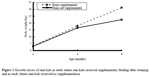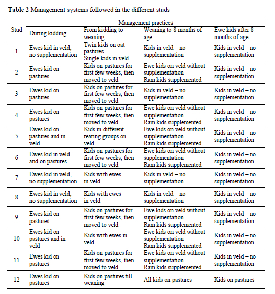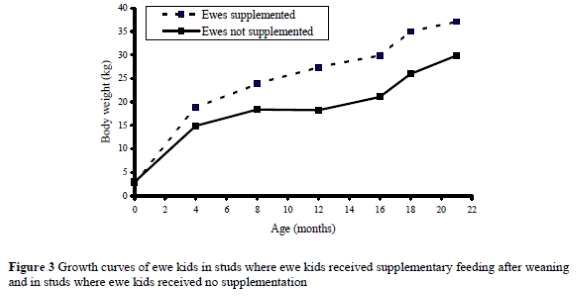 It is evident that pre-weaning growth rate of ram and ewe kids under the management systems followed in the participating studs was satisfactory. However, post-weaning growth rate of those kids (ram and ewe) that did not receive supplementary feeding after weaning was unacceptable. The poor growth rate of especially ewe kids after weaning up to 12 months of age is a serious problem that should be addressed, as it directly influences the reproductive ability of the young ewes. This was again evident from the poor reproductive performance of the young ewes in some of the studs.