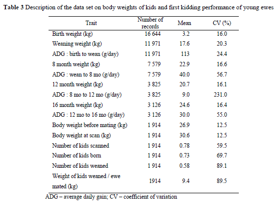 Body weights of 1 914 of the young ewes that were retained in the studs were recorded at their first mating at 18 months of age, as well as when these young ewes were scanned for pregnancy at 21 months of age. The reproductive performance at first kidding in terms of number of kids at scanning, number of kids born, number of kids weaned and weight of kids weaned per ewe, were also recorded.