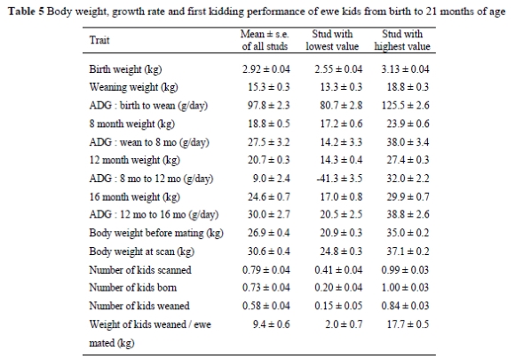 The number of records analysed for each trait, as well as the mean and coefficient of variation for each trait is summarized in Table 3. Means as well as minimum and maximum values among studs for birth weight, weaning weight and 8-month body weight of ram kids born from 2000 to 2004 in the different studs are summarized in Table 4. Corresponding data on body weights of the ewe kids from birth to 16 months of age, their body weight at first mating at 18 months of age, their body weight recorded at the subsequent scanning for pregnancy at 21 months of age and their reproductive performance at first kidding, are presented in Table 5.