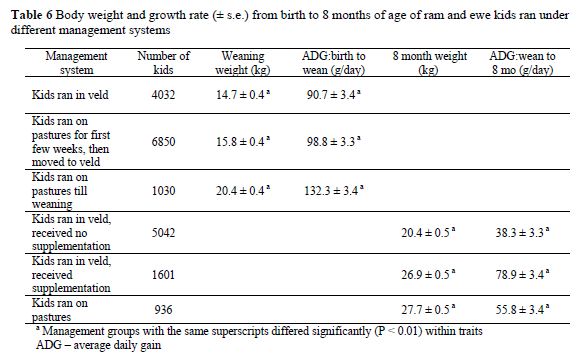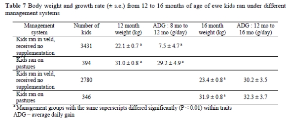 Growth rates of kids in the different studs varied substantially, and this can be ascribed largely to different environments and supplementary feeding practices. The effect of different pre- and post-weaning management systems on body weight and growth rate of the ram and ewe kids from birth to 8 months of age is presented in Table 6. Corresponding data for ewe kids from 12 to 16 months of age are given in Table 7. It is evident that pre-weaning management system had a significant effect on weaning weight where kids that were kept on pasture until weaning were respectively 5.7 kg and 4.6 kg heavier than kids that were kept on the veld and kids that were run on pastures for a few weeks before being moved to the veld. The quantity and quality of feed available to the ewe and the kid therefore contributed significantly to weaning weight. A similar trend was evident in 8-, 12- and 16-month body weights where those kids that ran on pastures or received supplementation on the veld had higher body weights than the kids that were run on the veld without any supplementation.