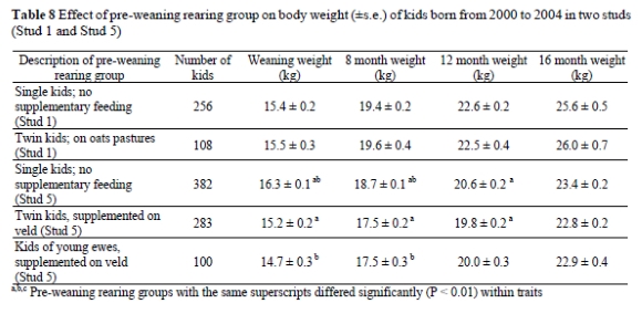 The effect of pre-weaning rearing group on weaning weight and subsequent body weights of ewe kids born from 2000 to 2004 in Stud 1 and Stud 5 where kids received different treatments before weaning, is presented in Table 8. In Stud 1 pre-weaning treatment did not have any effect on weaning weight or body weight at older ages. In Stud 5 the single kids remained heavier than the other groups up to 18 months of age (P < 0.01). The validity of this should, however, be investigated further, as these data were recorded in a survey study, which means that no scientifically designed experimental procedures were followed. The management and pre-weaning practices as followed by each farmer were used. Since there were no suitable control groups, those groups that did receive supplementation could have performed much worse up to 16 months of age if they did not receive any pre-weaning supplementation.