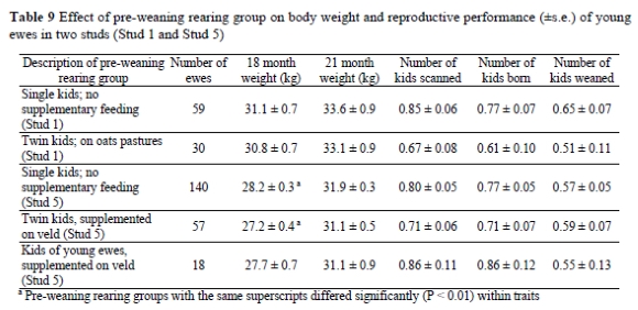The effect of pre-weaning rearing group on weaning weight and subsequent body weights of 1 159 kids in two studs (Stud 1 and Stud 5) where the kids received different treatments before weaning, were obtained from the analysis described above. For this analysis, only body weights for the ewe kids were taken, because weights of ram kids were recorded only up to 8 months of age. Body weights at 18 and 21 months of age and first kidding performance data of 304 young ewes which were part of some of the pre-weaning treatment groups in Studs 1 and 5, were analysed to determine if pre-weaning treatment had any carry-over effect on body weight and kidding performance at 18 months onwards. Fixed effects included for this analysis were stud-year-rearing group.