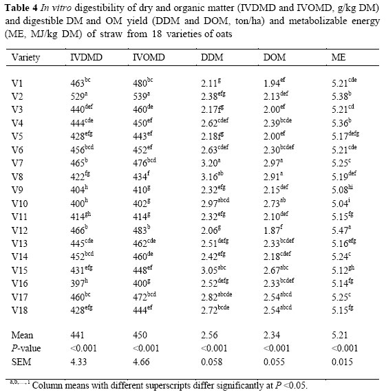 Considering the importance of straw in diets for ruminants in the world, it is suggested that selection of new oat varieties should take into consideration the nutritive value of the straw as well as the quantities of seed and straw produced. The study showed the presence of considerable varietal differences in nutritive value of straw from 18 varieties of oats. Cell wall content, digestibility and potential gas production of fermentation of straws were affected by variety. There were significant negative correlations between IVOMD, gas production and cell wall fractions. These variations indicate that in any evaluation of oat varieties, not only yield, but digestible OM yield of straw and partitioning factor as index of intake, as well - as the digestibility of straw, should be taken into consideration, particularly in areas where straw from these grasses is considered an important feedstuff for ruminants.