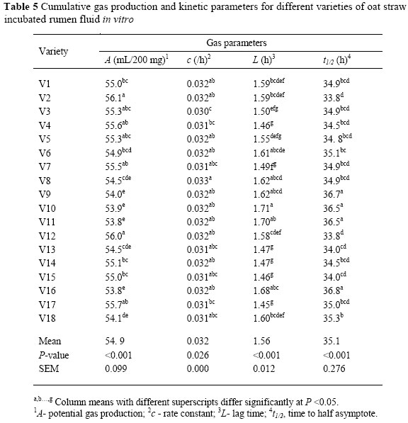 Gas production kinetic parameters of straw from oat varieties are presented in Table 5. There were differences (P <0.01) among varieties in asymptotic gas production (A) and lag time (L). Potential gas production (A) ranged from 53.8 to 56.0 mL/200 mg. The constant rate (c) was also different (P <0.05) among varieties. The differences in gas production characteristics may partly be due to differences in CP, NDF and ADF concentrations. Nsahlai et al. (1994) and Larbi et al. (1998) reported that there was a positive correlation between CP and the rate of gas production, and negative correlations between NDF and ADF with the rate and extent of gas production. Asymptotic gas production (4) was lowest in V16 and highest in V2. These findings were in line with the in vitro digestibility results in which V16 and V2 showed the lowest and the highest IVOMD, respectively (r = 0.53, P <0.01). The rate at which gas was produced (c) was not altered much in different varieties. Therefore, it appeared that the rate of gas production was not responsible for the differences in the total gas production. Varieties with higher gas production had a shorter half time (t1/2). The negative correlation found between asymptotic gas production (4) with either NDF and ADF (r = -0.47, r = -0.50, P <0.01) is consistent with the results of Haddi et al. (2003). The negative effect of cell wall content on gas production could be the result of a reduction of microbial activity through increasing the adverse environmental conditions as incubation time progresses. The values of potential gas production and fractional rate of gas production (c) of experimental varieties of oats were consistent with those (56.6 mL/200 mg DM and 0.031/h, respectively) reported by Lopez et al. (2005).