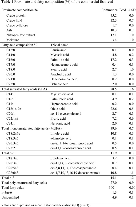 Since commercial feeds usually contain high proportions of lipids rich in SFA and MUFA, but are deficient in n-3 PUFA (Table 1), cultured fish lipids contain low n-3 PUFA concentrations compared to the wild species. The nutritional quality of lipid components is reduced with a lower n-3 PUFA rate in cultured fish. However, beneficial health aspects and consumers' demands can be compensated by proper choice of dietary lipid. The cost effectiveness of aquafeed formulations is a main factor (Ackman & Takeuchi, 1986).