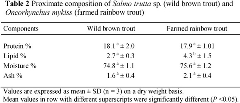 Comparison of proximate and fatty acid compositions of wild brown trout and farmed rainbow trout