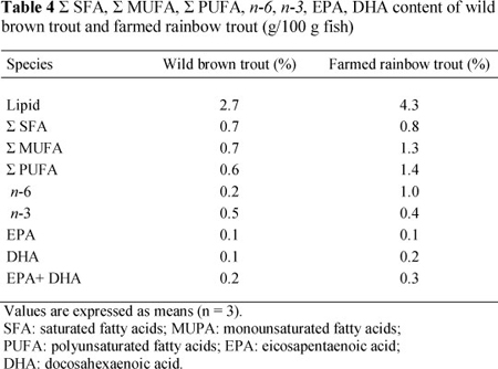 The fatty acid composition of trout species in g/100 g wet weights is presented in Table 4. The variation in fatty acid composition of fish is important as a source of the essential components for human nutrition. The British Nutrition Foundation (1992) recommended a daily consumption of 0.2 g of EPA and DHA for a balanced and healthy diet.