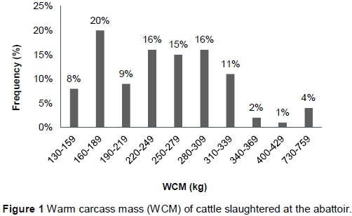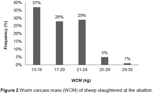 A similar trend was observed in WCM of all three livestock species tested. There were fewer animals of high WCM than of low WCM in all the livestock species tested, with ranges (1% - 4%; 1% - 5% and 24%) for cattle, sheep and pigs, respectively (Figures 1, 2 and 3). Warm carcass mass can be used to determine the dressing percentage of animals and it has been reported that heavier animals result in higher returns which may be attributed to the fact that they have more muscles than fat and are thus leaner (Knight, 2013). Lean meat is said to be generally preferred in the market and therefore fetches higher premiums. Since WCM has also been proven to have an influence on carcass quality traits such as lean-fat ratio, this therefore suggests that if WCM was included in the South African classification system, most farmers slaughtering their animals in this abattoir would be receiving low premiums as they are producing animals of low WCM with less lean meat. Therefore, WCM could motivate farmers to produce animals of high weights thus improving carcass quality traits such as the lean-to fat ratio. In addition dressing percentage with heavier breeds would produce more muscle and more lean meat per carcass (Knight, 2013).
