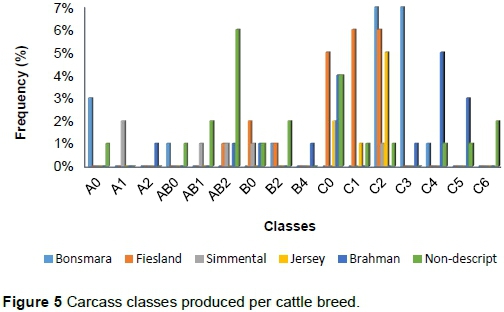 Figure 5 shows that most of the farmers produce cattle of the C-age class. Meat from the C-class animals is classified as meat from very old animals with low tenderness (SAMIC, 2006). Consequently these cattle fetch lower premium bonuses because of their age classification. The C-class was mostly dominated by the Bonsmara breed and particularly the C2-class. According to SAMIC (2006) a score of 2 in the fat class is classified as lean meat, thus the fat content in the C2-class is low, giving an advantage of high premium bonuses to these farmers because consumers prefer lean meat.