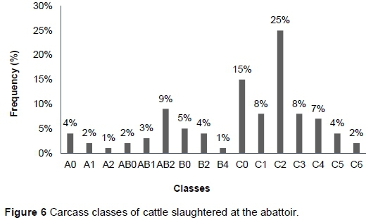 Figure 6 shows that a very low percentage (7%) of farmers produces beef carcasses of the A-class while a large percentage (69%) produces cattle of the C-class. The percentages of AB- and B-classes on the other hand are in between the A- and C-classes with percentages of 14% and 10%, respectively. The dominant fat score was 2 (39%) which is classified as lean meat which is generally preferred in the market.