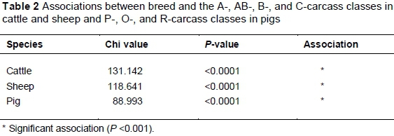 Although the classification system allocates scores on the extremes of these characteristics (age, sex, bruising, fat and conformation) it does not rank for the quality to be expected from each of the carcass classes exhibiting such extremes. This can prove problematic for consumers because they do not know what type of quality they are paying for in a specific class. Moreover animal traits such as breed are not included in the classification system. Breed has been proven to affect carcass and meat quality (Juárez et al., 2009). In addition, carcass traits such as warm carcass mass (WCM) are significant for the determination of lean and fat carcasses through dressing percentage (Knight, 2013). This therefore suggests that associations should be tested between animal traits such as breed, carcass traits such as warm carcass mass (WCM) and carcass classes in the classification system. The objective of this study was, therefore, to determine the associations between animal traits, carcass traits and carcass classes within cattle, sheep and pigs that were slaughtered in a high throughput abattoir.