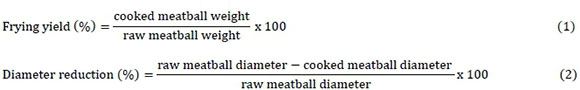 To calculate the frying yield and diameter reduction values, the weight and diameter of meatballs, before and after frying, were measured according to Equations (1) and (2):