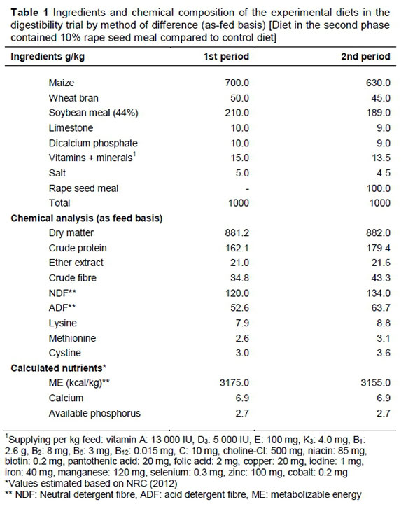 In the digestibility trial, four castrated male Large White χ Landrace pigs of an initial bodyweight of 40.3 ± 2.4 kg were used and kept in individual digestibility cages during the whole trial, in the Laboratory of Nutrition, School of Agriculture, Aristotle University. Each cage was provided with a one-sided self-feeder and a nipple drinker that allowed access to feed and water throughout the experiment. The experiment lasted 38 days and was divided into three periods: one adaptation-preliminary period of 10 days, and two experimental periods of 14 days each (10 for adaptation and 4 for faecal and urine collection). During the adaptation period, all the pigs were fed a typical grower diet ad libitum based on corn and soybean meal. During the first experimental period, all pigs were fed 1500 g/day of the same diet, while during the second experimental period the pigs were fed 1350 g of the same diet and 150 g of RSM daily. The typical grower diet was calculated to contain 16.2% crude protein (CP) and 3175 kcal metabolizable energy (ME)/kg (Table 1). The feed was supplied twice daily, whereas access to water was free. The pigs were housed in an environmentally controlled room. The temperature for the whole duration of the digestibility trial was set at 22.2 ± 2.0 °C and humidity at 55-65%. RSM was obtained from a batch of seeds processed by the Greek company EL.VI. AVEE (Hellenic Biodizel, SA, Stavrohori, Kilkis) in north Greece. Faeces were collected immediately into polyethylene bags (one bag per pig) in the metabolism crates. Samples were collected daily and weights were recorded during the sample collection period. Then, 25% of faecal samples were collected in polyethylene bags and stored in a freezer for further analyses. After sorting samples by pig, they were mixed by period and pig in a large basin. Following homogenization, samples were dried at 65 °C and then used to determine the nutrient concentrations. The determination of dry matter (DM), crude protein (CP), ether extract (EE), crude fibre (CF) and ash was according to methods 976.06, 920.39, 978.10 and 942.05, respectively, of the AOAC (1990). Neutral detergent fibre (NDF) and acid detergent fibre (ADF) were determined according to the methods of Van Soest et al. (1991). Hemicellulose was calculated as NDF minus ADF and cellulose as ADF minus ADL. Gross energy (GE) content of samples was measured by bomb calorimetry (Gallenkamp, Autobomb, automatic adiabatic bomb calorimeter). The concentrations of lysine, methionine and cystine amino acids in RSM, diets and faecal samples were calculated with a special analyser (CK-3000, Eppendorf-Biotronik; Germany). The apparent ME of the RSM was calculated according to the equation of Morgan et al. (1975): ME = DE x (0.997 minus 0.000189 % CP). DE per kg of RSM, the digestibility of RSM energy and the apparent digestibility coefficients (%) of RSM nutrients were assessed by the method of difference (McDonald et al., 2011). The method of difference is recommended when high levels of raw materials cannot be used because of toxicity or lack of palatability (Newkirk 2009).