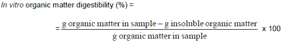 In vivo organic matter digestibility (%) = (feed dry matter consumed x % organic matter feed) - (faeces dry matter produced x % organic matter faeces) = organic matter disappeared / (feed consumed x % organic matter feed)