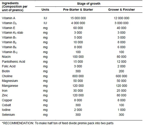 Composition of the vitamin and mineral premix used in the four ostrich feeding phases (pre-starter, starter, grower and finisher) formulated per ton of feed