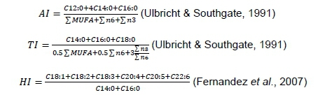 The AI, TI, and HI indices were calculated from the FA profile using the following equations: