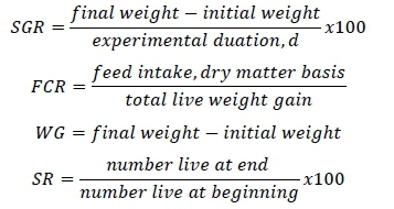 The tanks were cleaned every morning by siphoning out one third of the water. The dead fingerlings were removed, counted and recorded. Water quality parameters were monitored and recorded daily with a water quality meter. Dissolved oxygen ranged between 2.3 and 7.1 mg/L. Ammonia was <0.05 mg/L. Nitrite was between 0.05 and 2 mg/L. Nitrate was 250 mg/L. pH was between 6.8 and 8. Temperature was 24.7 °C to 29.8 °C. After seven days of acclimatization the catfish were weighed individually, then every week for seven weeks. The length was measured from the mouth of the fish to the end of the hypural bone, determined by bending the caudal fin, and the depth was measured between the dorsal and ventral fins (Skelton, 2001). Microsoft Excel (Microsoft Corp., Redmond, Washington, United States) was used for data management. Specific growth rate (SGR), feed conversion ratio (FCR), weight gain (WG), and survival rate (SR) were calculated following Duman (2020):