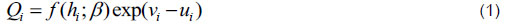 where Qi represents the quantity of wool produced by the Ithfarm (i = 1, 2, ...N), hi represents a (1xk) vector of production inputs of the Ith farm, and βis a (kxl) vector of unknown parameters to be assessed. As posited by Aigner et al. (1977), vi represents the stochastic noise, which is symmetrically