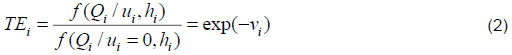 According to the production frontier function as indicated in Equation (1), this study outlines the technical efficiency of the Ith wool farm as the ratio of the observed wool average output, in line with the production inputs (xi) and its hypothesised technical inefficiency (ui), vis-à-vis, conforming possible output if the technical inefficiency effect does not exist (ui = 0) in wool production. The technical efficiency of an Ith farm can thus be specified as: