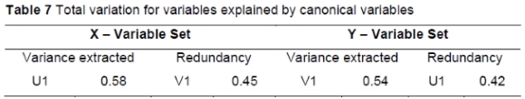 where Pv = the variance ratio calculated from a set of variables through a canonical variable of the cluster, a2 = squared correlation and the number of variables in the cluster, rd = redundancy, and rd = (pv) (r2c).