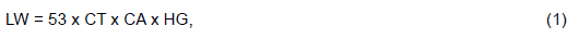 The live weight (LW) in kilograms was estimated using Boue (1949) biometric formula: