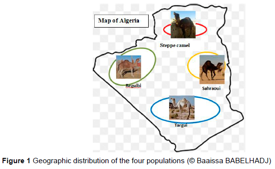 The dromedary is one of the animals most adapted to the desert climate, which has allowed for the sustainability of life in these regions. Its meat and milk are highly nutritious, and their commercialization provides a significant source of income in the oases. The dromedary is an important component of the desert ecosystem. In arid regions, this animal is raised alongside other livestock animals (such as cattle, sheep, goats, horses) for its produce (milk, meat) (Guintard and Babelhadj, 2018). According to Denis & Digard (2019), after goats, camelids are the herbivore species with the highest increasing numbers in the world. Indeed, the dromedary provides animal proteins (meat and milk) essential for the Saharan population. In fact, the current interest in consuming dromedary meat as red meat is partly based on its attributed therapeutic or medicinal virtues (Abdelhadi et al., 2017; Ayyash et al., 2019; Popova et al., 2021). Today, multidisciplinary research is being conducted in many countries on dromedary meat and milk for the adoption of efficient production systems, improvement of their processing, and commercialization. According to Harek et al. (2017), 97 populations of dromedaries are recorded on Earth, with 26 in Africa and 10 in Algeria. The Targui and Sahraoui populations are the most widespread. According to Ezzahiri (1988), animals from the Sahraoui population are tall, strong, and robust. Messaoudi (1999) describes the Targui dromedary as a tall animal with slender and dry limbs, grey coat with very short and fine hair. The camel population of the Ouled Naïl tribes, or steppe camel, is believed to be very ancient (11th century) and may correspond to a morphotype adapted to steppe areas, indicating a relatively small but well-formed animal with little selection. In this sense, the steppe camel holds importance, and even though its numbers are not large, it is interesting to characterize it precisely (Harek et al., 2017). The Reguibi population consists of excellent racing camels and is distributed in the western Sahara, southern Oran (Béchar, Tindouf); its origin, Oum El Assel (Reguibet) (Benaissa, 1989).