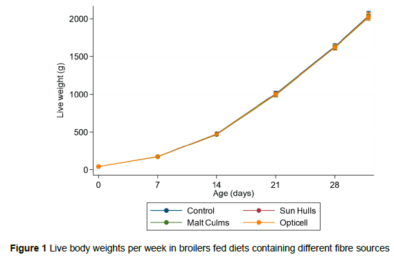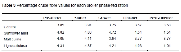 Although not statistically significant, the malt culms group showed a numerically higher gizzard to body weight ratio at 7 d, numerically lower body weights at 21 and 32 d, and a lower ADG for the 28-32-d period. The crude fibre value of malt culms was 15%, compared with 50% and 59% for sunflower hulls & lignocellulose, respectively. This may explain the slight differences observed and, in retrospect, would exclude malt culms from future trials for the purpose of adding dietary fibre.
