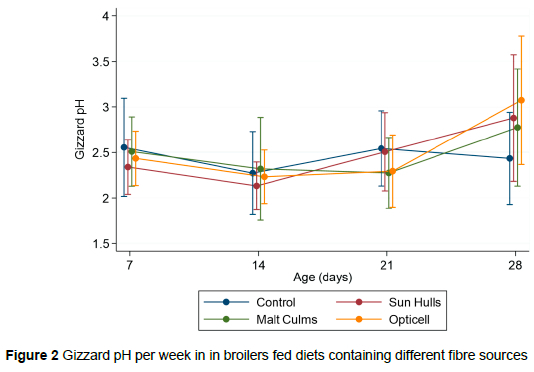 The lignocellulose group had a statistically higher gizzard pH at 28 d, with the sun hulls group showing a numerically higher pH at the same age. When considering the other trials' results (Table 1), a higher pH did not promote performance. There were wide differences between ages and even within groups, which suggests that statistical differences would be hard to achieve. Only the control group's gizzard pH remained relatively constant with means of 2.27-2.56 over the four measurement periods. This compares with Lee's pH measurements in broilers of 1.99-2.29 (Lee et al., 2021). Nishi (2016), however, reported a pH of 3.51 at 28 d. These different ranges could well be attributed to differences in dietary composition and physiological differences between individual birds.
