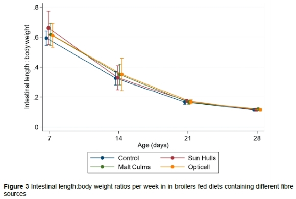 The sun hulls group had a total intestinal length to body weight ratio that was higher than the control group at 7 days (P = 0.02). The lengths over all treatments for different ages: