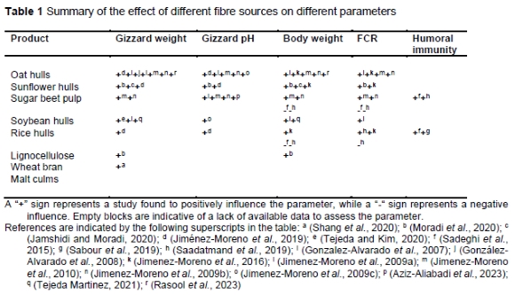 There are many studies that indicate that fibre sources can improve production and gut development in fast-growing broilers, despite their low nutritive value (Table 1). These fibre sources improve the development of the upper gastrointestinal tract in particular and can also have an immunomodulatory effect by altering the gut microflora and its interaction with the gut-associated lymphoid tissues.