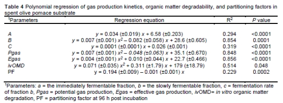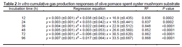 Table 4 indicates that a and c linearly increased, whereas PF decreased linearly in response to increasing OYM spawning rates. Positive quadratic effects (P <0.05) were noted for b, Pgas, Egas, and ivOMD in response to the varying OYM spawning levels. Gas production from the slowly degradable fraction (b) and ivOMD of spent OP substrate were minimized at 5.86 and 2.19% OYM spawning rate, respectively.