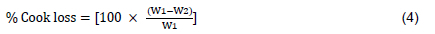 where: W1 is weight of raw meat samples before cooking and W2 is the post cook weight of the samples cooled.