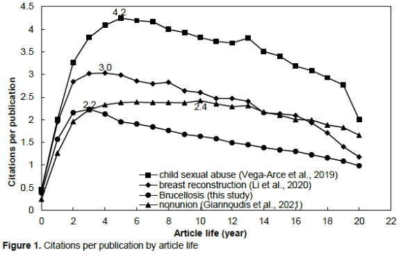 To understand publications in medical research topics, a relationship between the average number of citations per publication (CPPyear) and article life was proposed (Chuang et al., 2007). The article life with CPP2022 for all 9 022 brucellosis articles and the comparison to medical related topics is displayed in Fig. 1. It took CPPs three full years to reach a peak. Articles related to brucellosis took three full years to reach a peak CPPyear of 2.2. A peak appeared in four and five full years for breast reconstruction of (Li et al., 2020) and child sexual abuse (Vega et al., 2019) research with CPPyear of 3.0 and 4.2, respectively. After the peak, a decrease in CPPyear was generally found. However, articles related to non-union of fractures needed a longer citation life (ten full years) to reach the peak with CPPyear of 2.4.