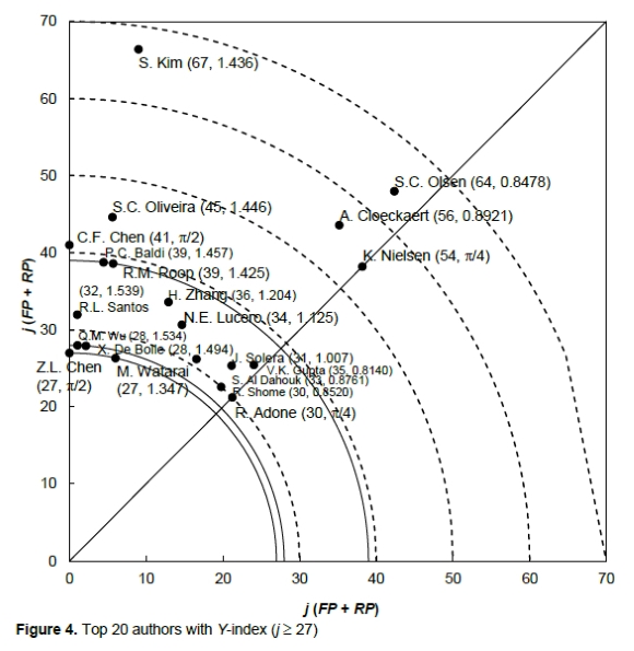 The Y-index was used to evaluate the publication performance of authors. The Y-index is defined as (Ho, 2012; Hsu & Ho, 2014) Y-index (j, h) where j is a constant related to the publication potential, the sum of the first author articles, and the corresponding author articles; and h is a constant related to the publication characteristics, polar angle of the proportion of RP to FP. The greater the value of j, the more the first and corresponding author contributes to the articles.