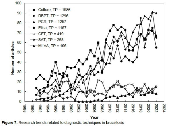 We investigated the research trends for "diagnosis". Overall, most publications used the keyword "culture" (TP = 1 586 articles), followed by "RBPT" (TP = 1 296 articles), "PCR" (TP = 1 257 articles), "ELISA" (TP = 1 157 articles), complement fixation test "CFT" (TP = 419 articles), simultaneous amplification and testing "SAT" (TP = 268 articles), and multiple-locus variable number tandem-repeat analysis "MLVA" (TP = 106 articles) (Fig. 7). Definitive diagnosis of brucellosis can be achieved by culture isolation and nucleic acid-based molecular identification. However, culture is tedious, time-consuming, and poses serious risks to laboratory personnel and the associated environment. Therefore, bacterial culture requires specific biosafety measures (BSL-3). Serological assays are more practical and are used for routine monitoring and diagnosis of brucellosis, particularly in resource-limited locations. However, the choice of the serological test to be used depends upon the epidemiology of the disease in a particular region, the cost of the test, and the sensitivity and specificity of the test. Serological assays such as RBPT, CFT, SAT, or ELISA are used for screening and/or confirmation. RBPT is a highly-sensitive, cost-effective test that can be performed under field conditions for screening of brucellosis in resource-poor, endemic countries. However, due to its low specificity, this test needs confirmatory tests with high specificity such as ELISA. Thus, RBPT is not recommended for screening in disease-free countries. Instead, assays with high sensitivity and specificity, such as ELISA or CFT, should be used. Additionally, culture-independent molecular diagnostic assays such as PCR [either conventional or quantitative (real-time)] and a multi-locus variable number of tandem repeat assays (MLVA) are being used to characterize and genotype Brucella isolates. PCR is considered a safe and reliable molecular method for the confirmation. MLVA remains the method of choice for genotyping in resource-poor settings and is helpful in characterising the origin of an outbreak and may also help in the development of better prophylaxis. Next Generation Sequencing (NGS) and bioinformatic pipelines will replace MLVA shortly in most developed countries.
