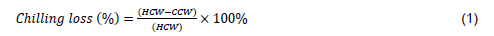 On the evening of day 42, six birds per pen (three males: three females) were fasted for 12 h (18:00 to 06:00) but provided with clean drinking water ad libitum. Next morning after group-weighing per pen to obtain the final live (slaughter) weights, birds were transported to Rooigrond poultry abattoir, ~30 km from the NWU experimental site. An hour after arrival at the abattoir, they were sacrificed humanely by cervical dislocation after electrical stunning (70 volts). The jugular vein was cut with a sharp knife at the base of the throat and allowed to bleed for 5 min. Following thorough bleeding, feathers were un-plucked, and the carcasses washed. The heads, necks, and feet were removed. Visceral organs were also removed by hand through an opening from the vent to the sternum and weighed individually. Hot carcass weight (HCW) was recorded immediately after slaughter at the abattoir, whereas cold carcass weight (CCW) was recorded 24 h post chilling (4 °C). Subsequently, chilling loss was calculated and expressed as a percentage using the formula: