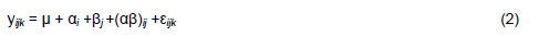 where yvijk = response variable, μ = overall mean, α = effect of diet, β; = effect of week, (aß)ij = diet × week interaction effect, and εijk = random error.