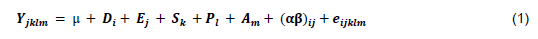where Yijklmn is the observed parameter value, μ the overall mean, Di the fixed effect of the ith diet, Ej the fixed effect of the jth enzyme dosage, Sk the random effect of the kth Latin square, Pl the random effect of the kth period, Am the random effect of the mth animal within a Latin square, (αβ) the diet x enzyme interaction, and eijklm the residual error. Means were separated using Tukey's test, at the P <0.05 level of significance.