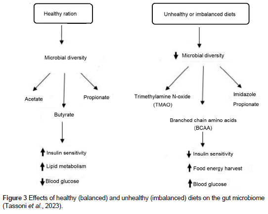 Imbalanced rations may lead to an increase in gut permeability, intestinal dysbiosis, the abundance of harmful bacteria, disharmony of the GM, impairment of digestive system function, and acceleration of the onset of chronic liver disorders (Figure 4). There are more than 26 symptoms of dysbiosis, including those related to the digestive system (gas production, stomach rumbling and flatulence, constipation or diarrhoea, acid reflux or heartburn, thickened tongue, strong fluctuations in appetite, abdominal pain, nausea, irregular bowl movements, and belching and bloating) and other physiological systems (anxiety, nervousness, chronic fatigue, hair loss, heart failure, and chest pain).