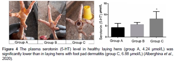 Tryptophan is an α-AA used in protein biosynthesis, and is a precursor for the biosynthesis of 5-HT and melatonin, which are endocrine neurotransmitters (Agus et al., 2018; 2020). Serotonin 5-hydroxytryptamine is a biogenic amine that serves as a neurotransmitter in the gut and brain, which is produced by serotonergic neurons in the brain (1%-2%) and by enterochromaffin cells and intestinal mucosa (95%) (Gershon & Tack, 2007). Serotonin plays a key role in various physiological body functions, including feeding, temperature regulation, mood, aggression, stress, depression, sexual behaviour, pain perception, motor control, circadian rhythm, and sleep (Walther et al., 2003; Nonogaki et al., 2008; 2009). Alberghina et al. (2020) reported that the normal plasma level of 5-HT in healthy layer hens was 4.24 μmol/L, and that this was significantly lower than in hens with foot pad dermatitis (6.88 μmol/L) (Figure 4). Approximately 95% of blood 5-HT is carried by platelets in mammals (Anderson et al., 1987). However, the measurement of 5-HT in plasma is more reliable than the measurement in whole blood for the assessment of the inflammatory response and the evaluation of chicken welfare (Alberghina et al., 2020).