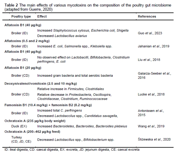 Studies on the effects of mycotoxins on the GM, and vice versa, have typically been conducted using high doses of mycotoxins, and research on the interactions between the GM and mycotoxins is still in its initial stages. It is therefore not possible to reach a conclusion about the impact of mycotoxins on health (Guerre, 2020). Administering a detoxifying compound at a dose of 1 g/kg to broiler chickens fed an aflatoxin-contaminated ration resulted in a stable GM, reduced the histopathological lesions of organs, and decreased some serum enzyme activities (Guo et al., 2023b). It can therefore be concluded that to prevent intestinal dysbiosis, the use of mycotoxin binders in poultry rations should be mandatory in high-risk areas (areas with high temperatures and humidity), in cases where feed has been improperly stored, in unsafe and low-quality feed, or for preventative purposes. Furthermore, better results have been obtained with multi-component binders that combine clay (bentonite or montmorillonite), yeasts (including glucomannans), and enzymatic detoxifiers (fumonisin esterase and zearalenone hydrolase).