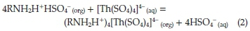 The revealed data for Th (IV) extraction was in a good agreement with many previously published papers. For instance, Eskandari Nasab et al.30reported that Th (IV) was extracted from 0.01 M nitric acid solution by Cyanex 272 in kerosene. Also, the extraction of Th (IV) from aqueous sulphuric acid medium with a synergistic mixture of N-n-octylaniline and trioctylamine (TOA) in xylene was investigated by Patkar et al.31According to Borai et al.,32in sulfate medium, thorium is extracted preferably by primary amines. The proposed mechanism for Th (IV) extraction by amines was illustrated in equation (2) by Shimidt:33