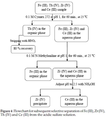 Finally, the recommended subsequent selective extraction for separation process of Fe (III), Zr (IV), Th (IV) and Ce (III) from aqueous sulfate medium is presented in Fig. 4.