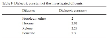Diluents influence the extraction of metals by amines and acids due to the aggregation of them in the organic phase.37 Therefore, various aromatic and aliphatic solvents with different dielectric constants were tested as diluents for the extraction of the investigated elements as shown in Table 3. The results obtained in Table 4 showed that both of petroleum ether and hexane are preferred for the extraction process, while xylene and benzene proved to be poor diluents. It was reported that there is a good correlation between the effect of a diluent and its dielectric con-stant.38 The diluents should have a low dielectric constant and weak hydrogen bonding capacity. Owing to several factors like cost, environmental and safety aspects and maximum extraction efficiency, aliphatic petroleum ether was preferred as the diluent for all the experimental work.
