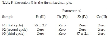 Series of experiments were attempts to separate Fe (III), Zr (IV), Th (IV) and Ce (III) from each other in a multielements mixed solution. These experiments were performed based on the previously optimized conditions for extraction of each element. Three mixed samples of the investigated elements were prepared to examine the effect of each element on the extraction and separation of the other three elements.