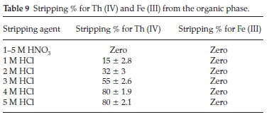 To choose the suitable stripping agent for Th (IV) and Fe (III), the organic phase of the first and second cycles were shaken with different concentrations of HCl and HNO3 in the range (1.0-5.0 M) with anA/Ophase ratio of 1:1, at equilibration time of 20 min, and at room temperature.