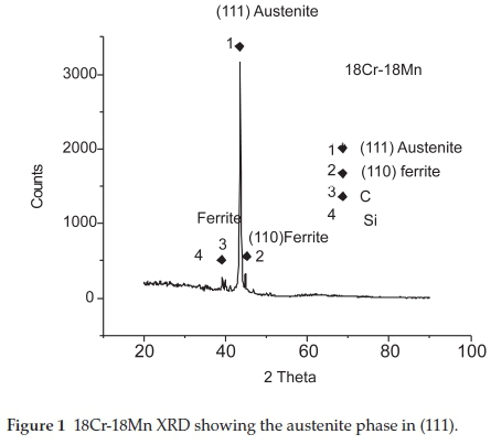 The presence of the austenite stability phase in the steel was determined by applying the equation (Creq/Nieq), and this was confirmed by X-ray diffraction.